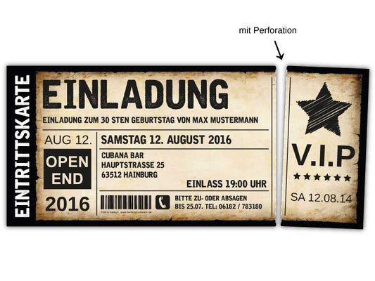 Vintage Einladungskarten zum Geburtstag als Ticket VIP