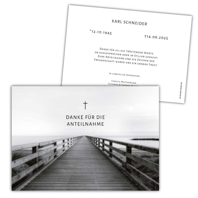 Motiv & Design: Das Design zeichnet sich durch seine schlichte Eleganz aus. Das Steg-Foto in dezenter Schwarz-Weiß-Optik strahlt Ruhe und Gelassenheit aus. Die schlichte Typografie und das feine Kreuzsymbol auf der Vorderseite unterstreichen die Würde der Trauer Danksagung.